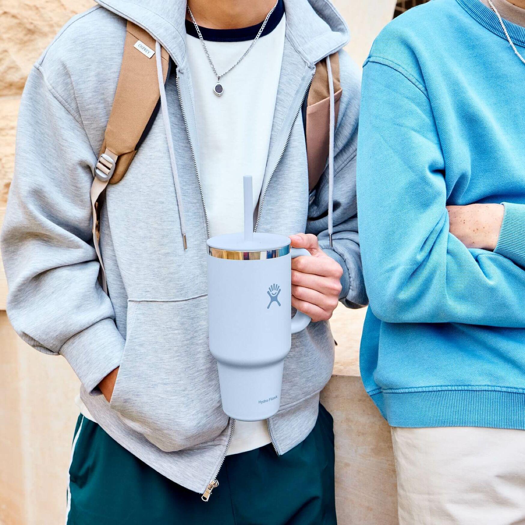 Hydro Flask Travel Tumbler ile mutluluk pozu veren arkadaşlar